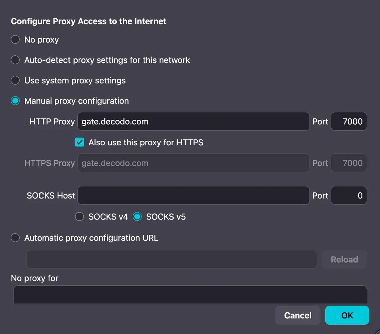 Yes, it does. Firefox uses system proxy settings by default. To use Decodo only within Firefox, go to Network Settings and switch the connection method to Manual proxy configuration.