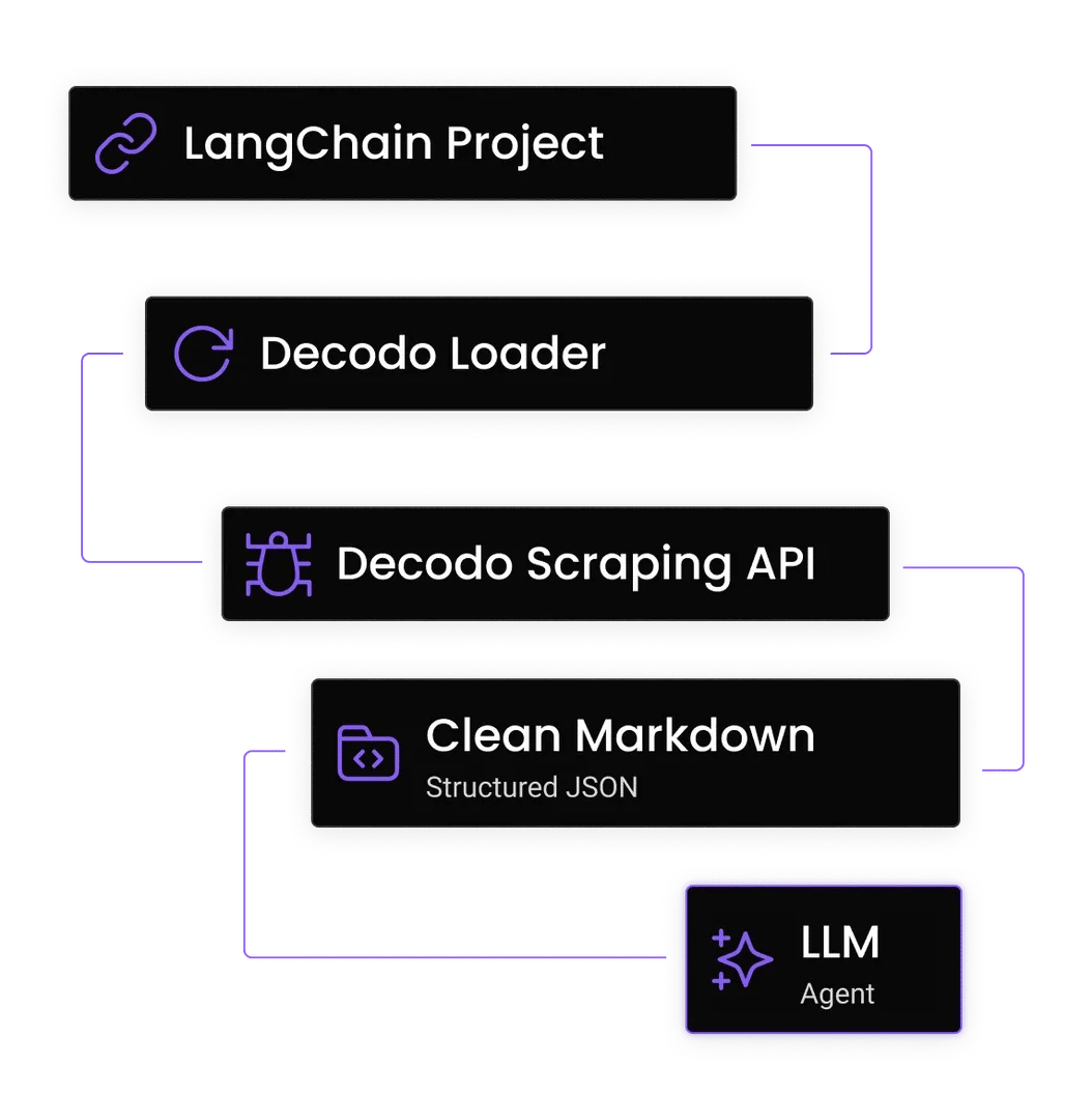 The Decodo LangChain Loader connects your LangChain project directly to our industrial-grade scraping infrastructure. It handles everything – proxies, JavaScript rendering, retries, and CAPTCHAs, so you can focus on building, not resolving your broken scrapers.