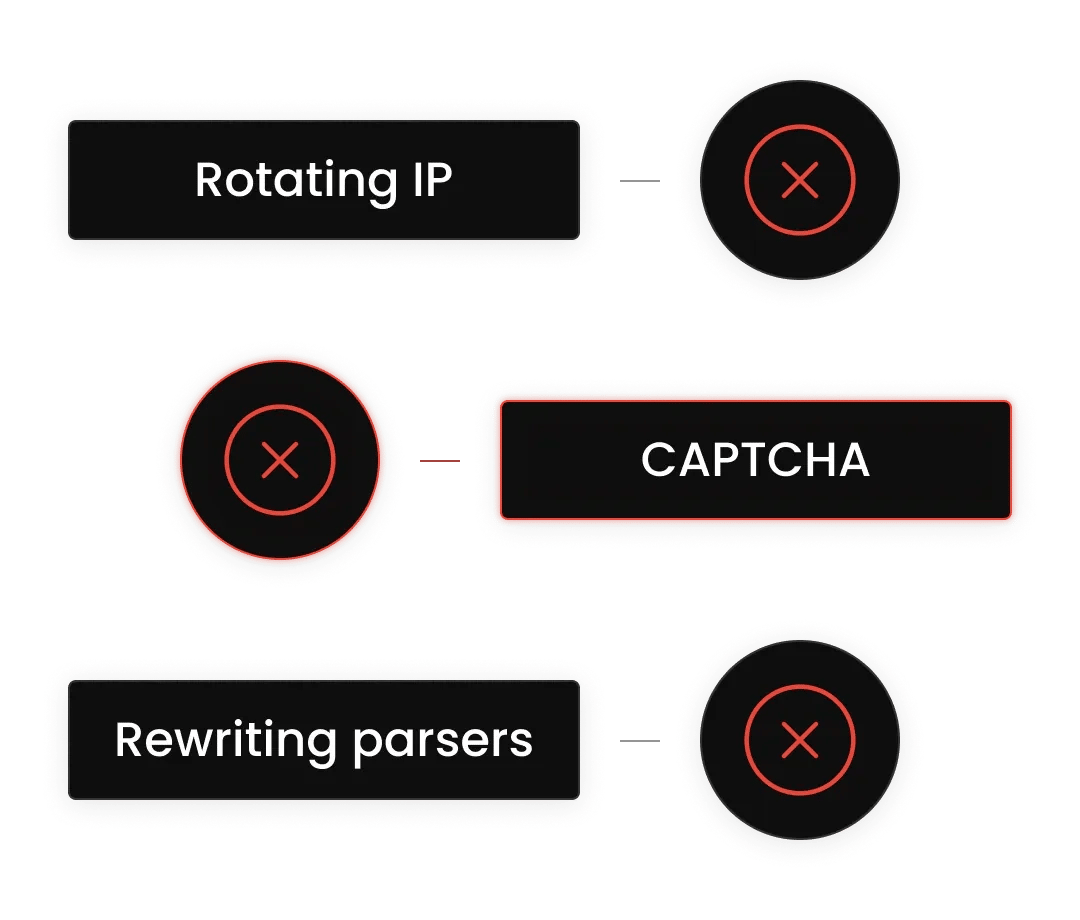 No rotating IP scripts, CAPTCHA debugging, or rewriting parsers every time a DOM shifts.