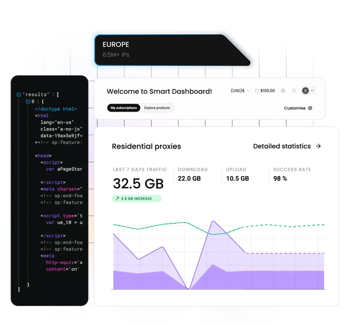 Add proxies to your workflow quickly with setup guides, code samples, and our 24/7 tech support team ready to assist whenever needed.