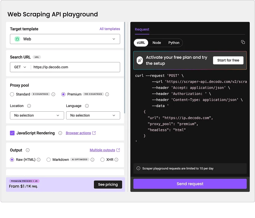 Decodo's dashboard includes a proxy configuration generator. Select your proxy type (residential, mobile, ISP, or datacenter), set your target country, choose rotating or sticky sessions, and copy the generated endpoint string directly into your scraper or browser extension. No code required. Pre-built scraping templates are also available for common Amazon collection workflows.