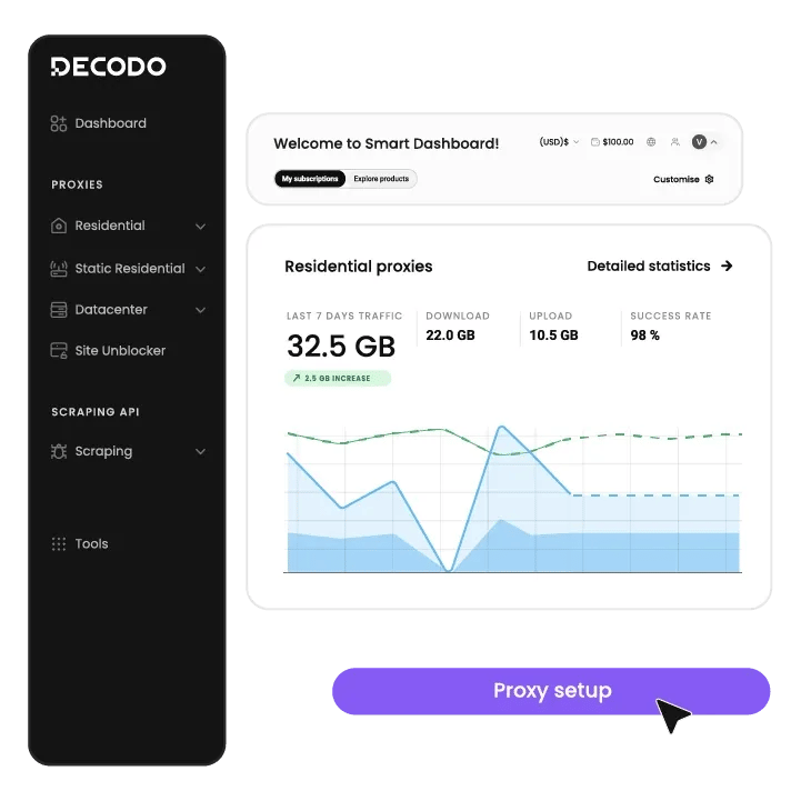 Proxy prices vary depending on the type of proxy and your use case. Decodo, for example, is known for offering the best value among all providers available in the market, with datacenter proxies starting at $0.026/IP and static residential proxies at $0.35/IP. The exact cost depends on the type of proxy and the volume you need.