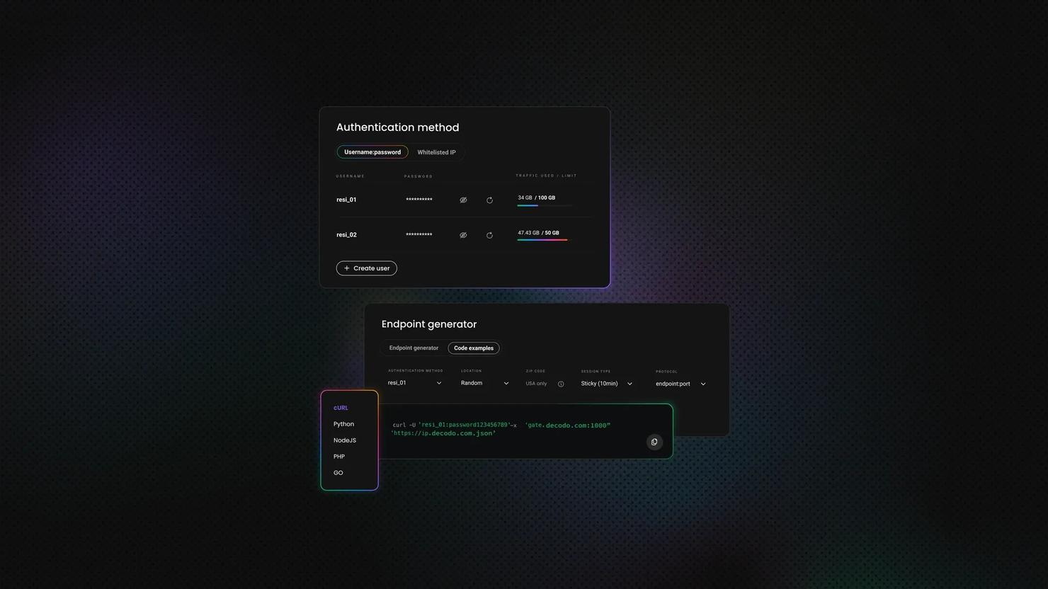 Choose between user:pass and IP whitelisting for quick integration into your scripts and bots.
