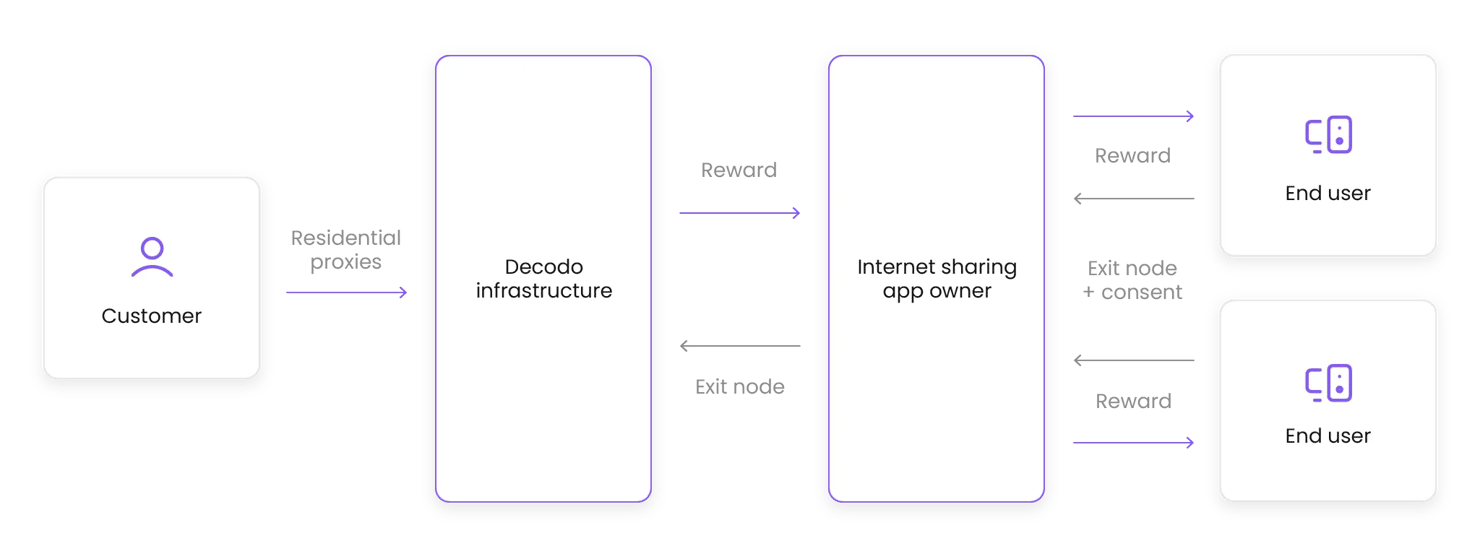 Decodo is dedicated to delivering value while upholding the principles of fairness, transparency, and industry best practices. We aim to cultivate a trust-based and sustainable industry where end-user awareness, consent, and equitable reward are the standard. Learn about our residential proxies’ procurement processes and policies.