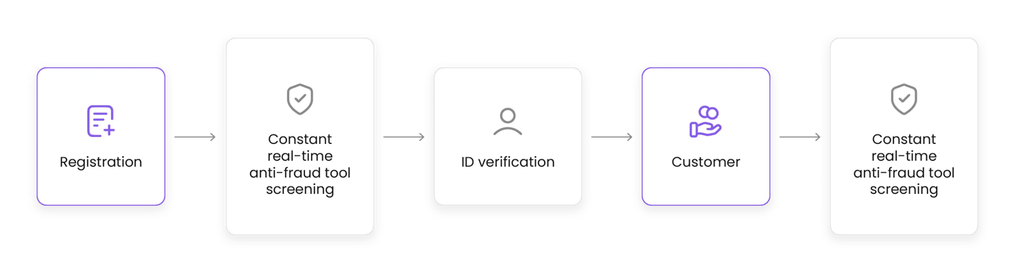 To prevent fraud, our customers undergo an automatic internal check during registration. If no suspicious activity is detected, they proceed through the KYC (Know Your Customer) process. Subsequently, an automated anti-fraud third-party tool provides us information about the nature of customers’ activities. Once approved, customers can make purchases for the company’s services.