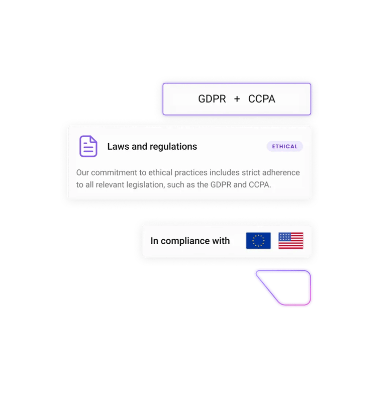 E.g., We’re committed to ethical practices and compliance with the GDPR, CCPA, and other current legislations.