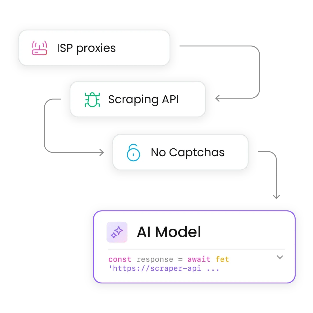 Pair ISP proxies with the Advanced Scraping API to automate tough targets without CAPTCHAs or fingerprint drama. Use AI Parser for JSON-clean outputs, Markdown for docs/notebooks, and our n8n node or MCP Server to orchestrate agent workflows in minutes.