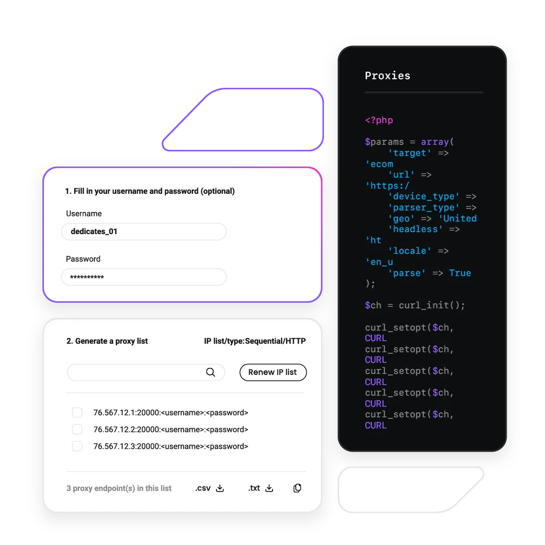 Add proxies to your toolstack with quick start guides, code examples, and our award-winning 24/7 tech support team – you’re always first in line.