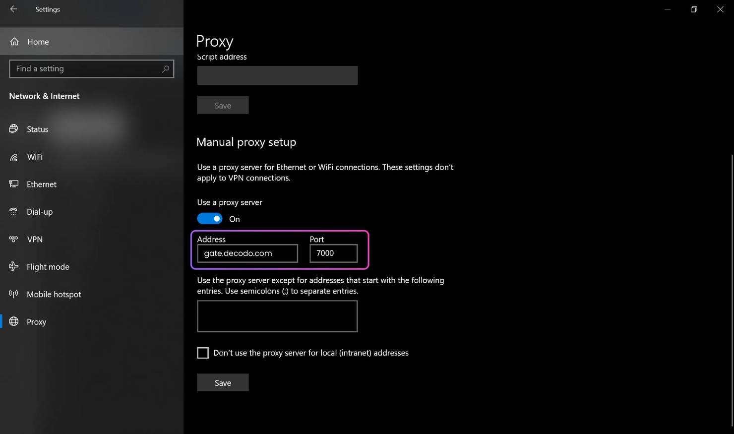 Under Manual proxy setup, click the toggle to enable Use a proxy server.