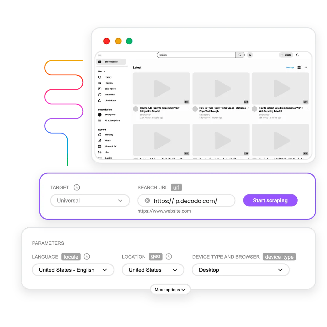 Yup, you’ll need to have a high-quality YouTube proxy to avoid any blocks and IP bans. No kidding, YouTube scrapers scale only with robust proxy networks that allow you to set up millions of unique IP addresses. We use real devices’ IPs registered with internet service providers that look exactly like an average Joe on the internet.