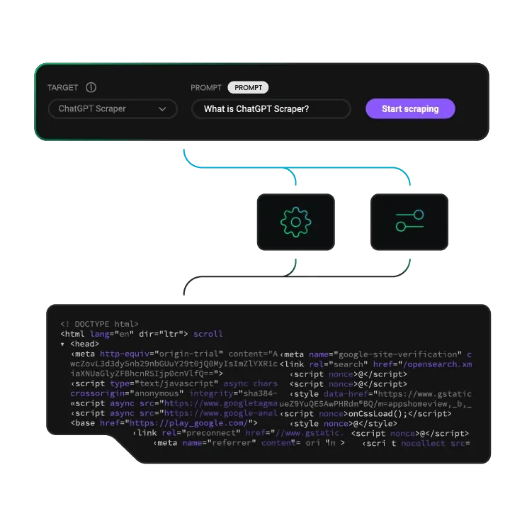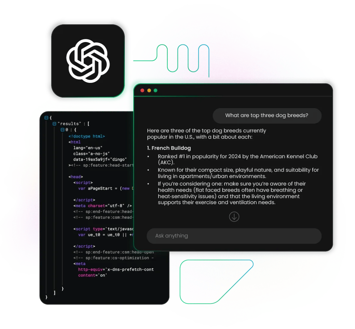 No setup needed. The ChatGPT target includes full JavaScript rendering, proxy rotation, and session management by default, so you can focus on data, not infrastructure.