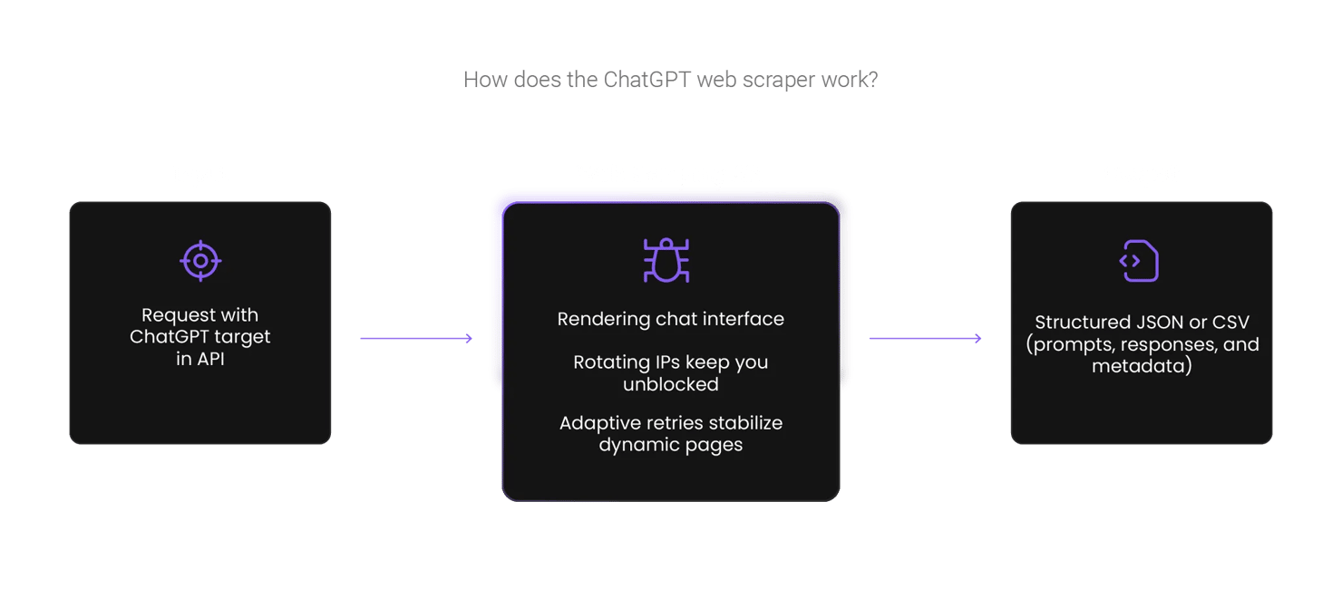 Whether you’re tracking model changes, studying prompt performance, or collecting real-world chat data, the ChatGPT target delivers structured JSON or CSV outputs from ChatGPT’s interface with full transparency and precision.