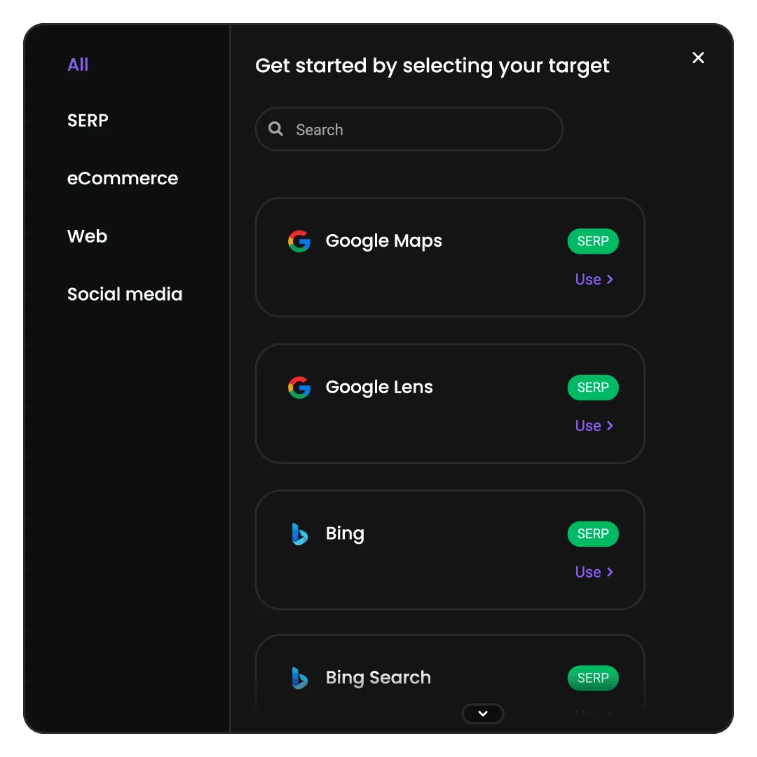 Once your account and scraper plan are set up, start by configuring your scraping tasks on our dashboard. In the Scraper tab, use the Web Scraper target, enter your target URL(s), and choose the desired parameters, such as location, language, and browser type. Follow our quick start guide to start scraping in minutes.