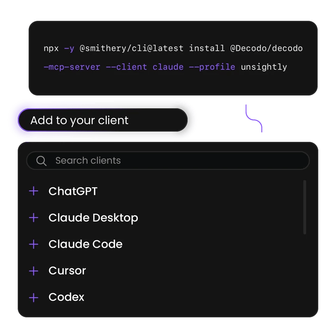Getting Decodo MCP running takes just minutes – no devops overhead, no complex configs. Choose the setup that fits your workflow: