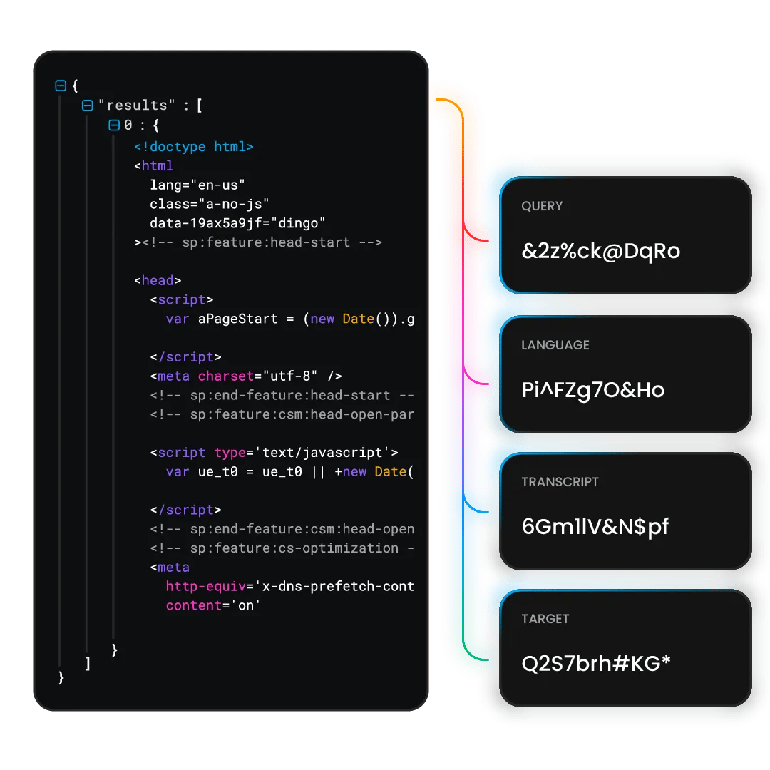 Decodo’s YouTube Scraper API delivers data in formats optimized for large-scale AI applications. Send a single API request and receive the data you need in HTML or structured JSON format. Even if a request fails, we’ll retry until the data is delivered. You'll only pay for successful requests.