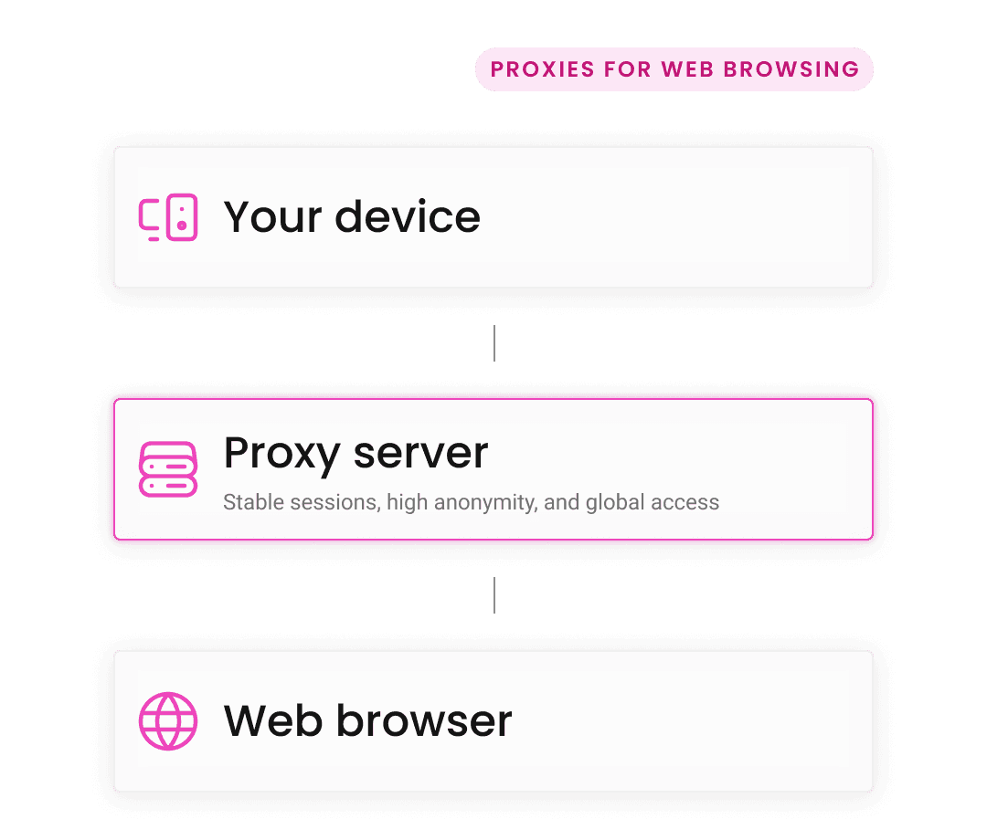 Your browser sends traffic to the proxy server first, and the proxy forwards the request to the target website. The website only sees the proxy IP, keeping your real IP hidden.
